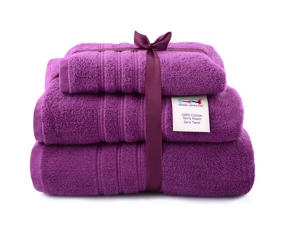 Το σετ περιλαμβάνει: πετσέτα χεριών 30x50cm, πετσέτα προσώπου 50x90cm, πετσέτα σώματος 70x140cm